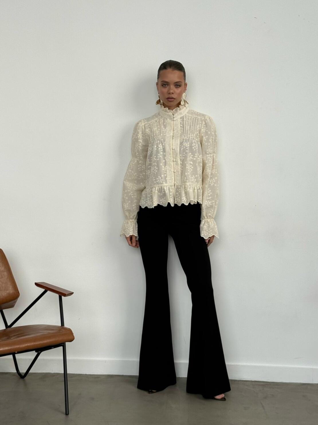 Брюки идеальной средней посадки и правильных пропорций имеют цельнокроеный пояс, клеш от колена, очень эффектно садятся по фигуре и делают ее визуально стройнее.