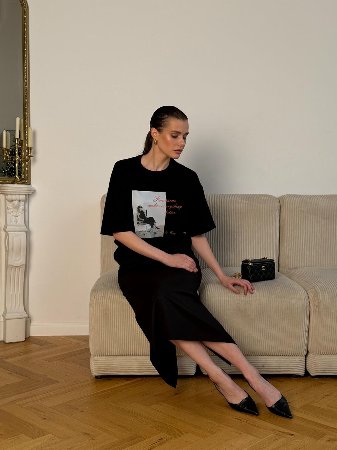 Яркая футболка из новогодней коллаборации с ироничной надписью — «Prosecco makes everything better»