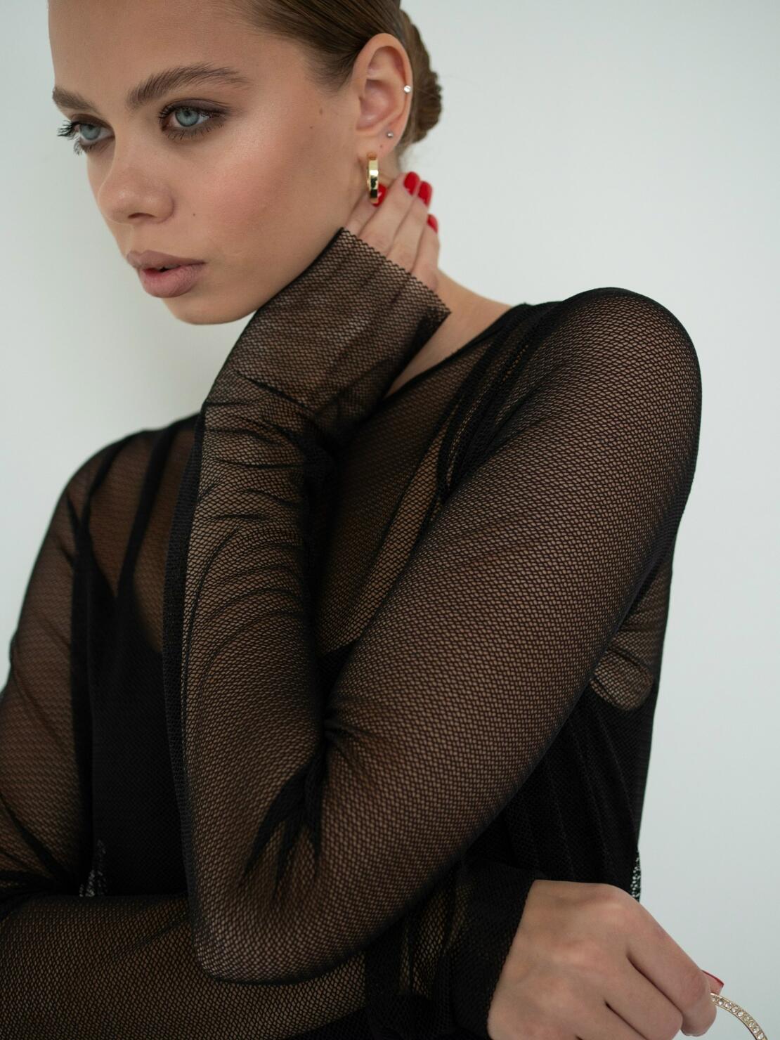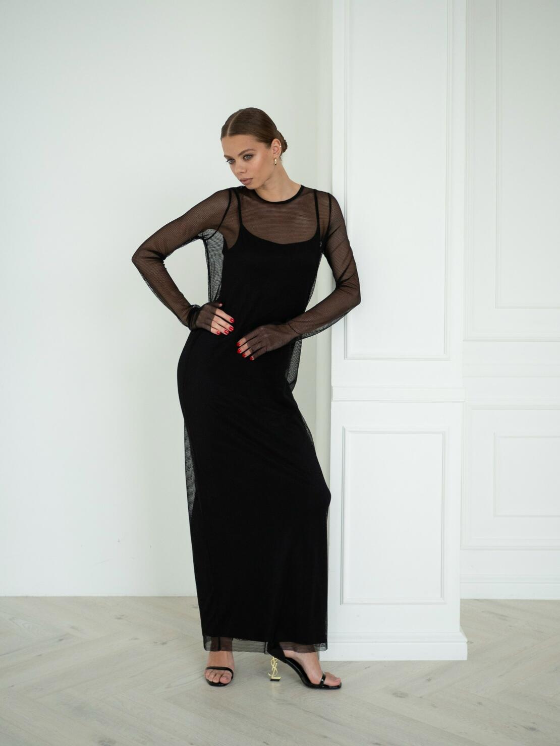 Двойное платье из нежного необычного кружева-сетки с нижним слоем из платья — комбинации черного оттенка.