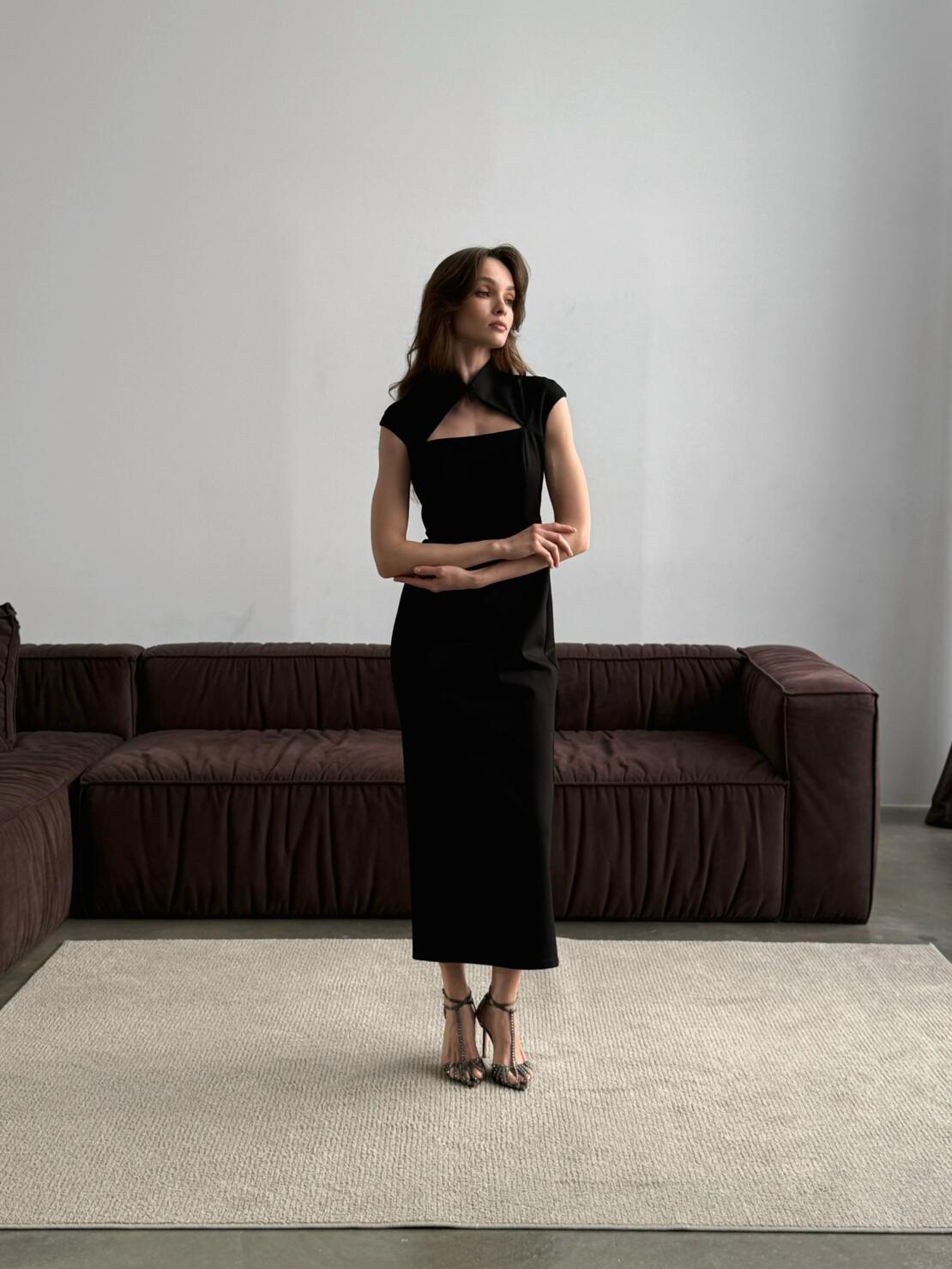 Мы создали его из легкого, тонкого матового трикотажа на основе вискозы — такой материал прекрасно дышит и струится в движении. Сверху платья эластичная сетка, которая идет полупрозрачным вторым слоем