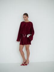 А чтобы сделать вас центром внимания на любой вечеринке, с внешней стороны материалу придали металлизированный блеск и пояс баску, которая делает особенный акцент на талии, в комплекте к платью идет пояс — цепочка.
