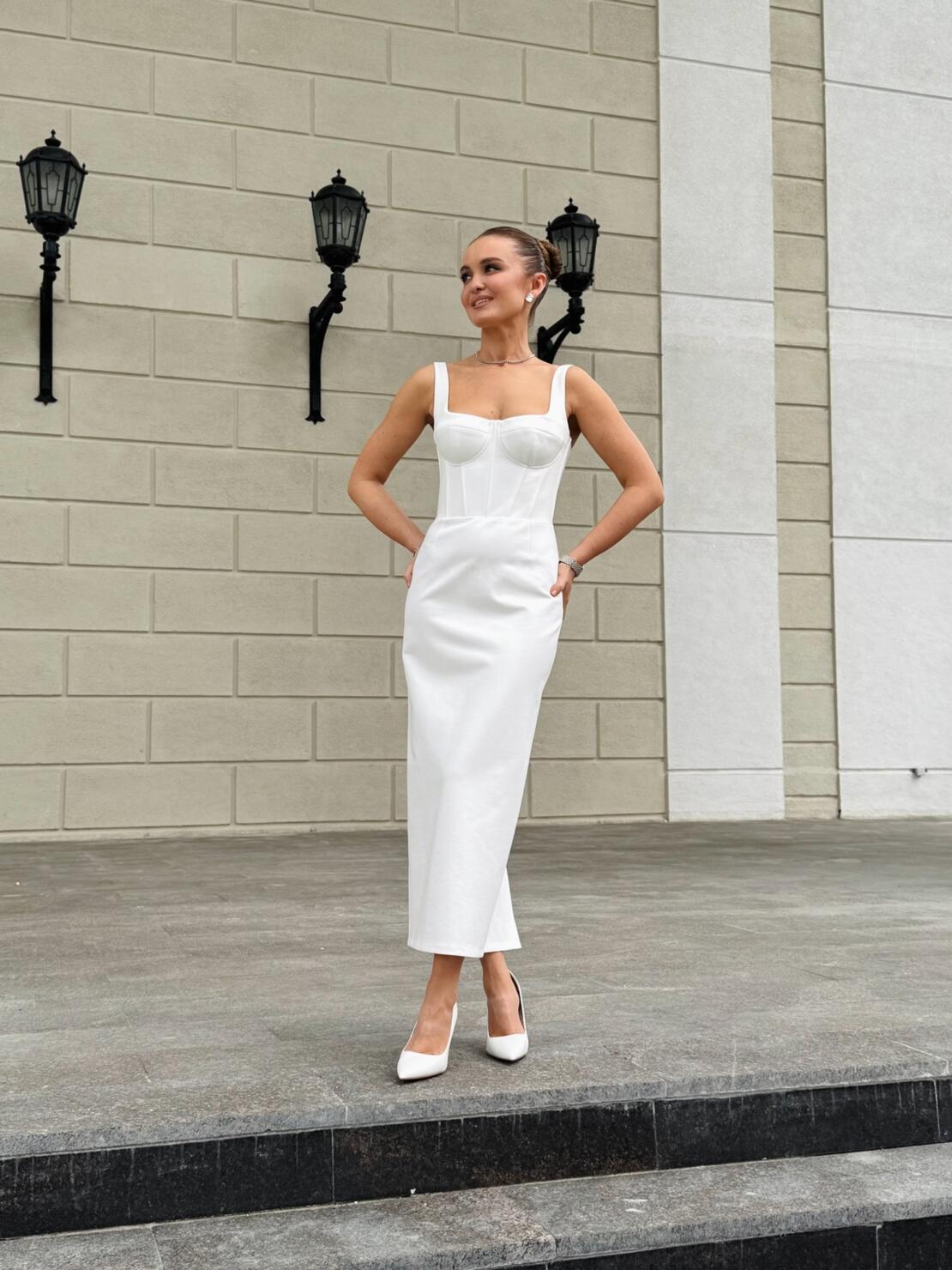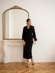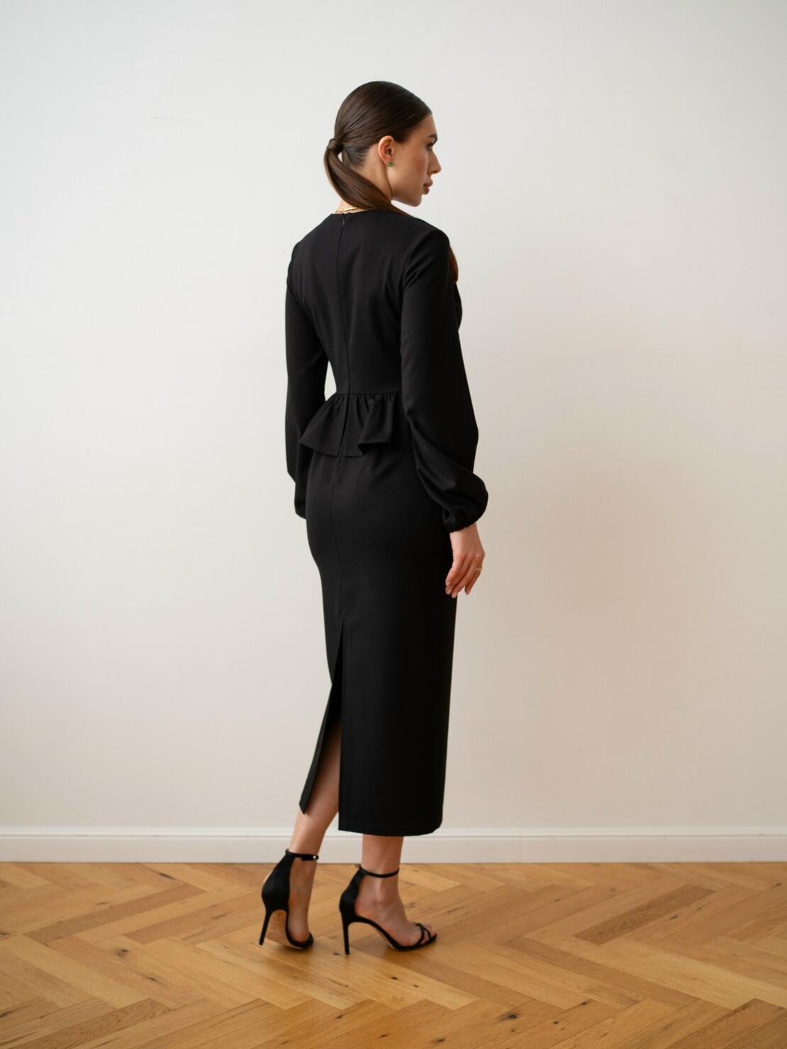 Платье — футляр в длине «миди». Прилегающий силуэт, воздушный рукав, аккуратный V-вырез — такое можно стилизовать как для вечера, так и для повседневных образов.