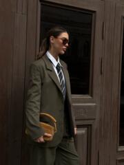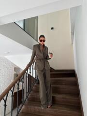 Однобортный жакет, брюки «палаццо» и главная фишка — это шнурки, вы можете повязать их на брюки, жакет или использовать в качестве пояса.