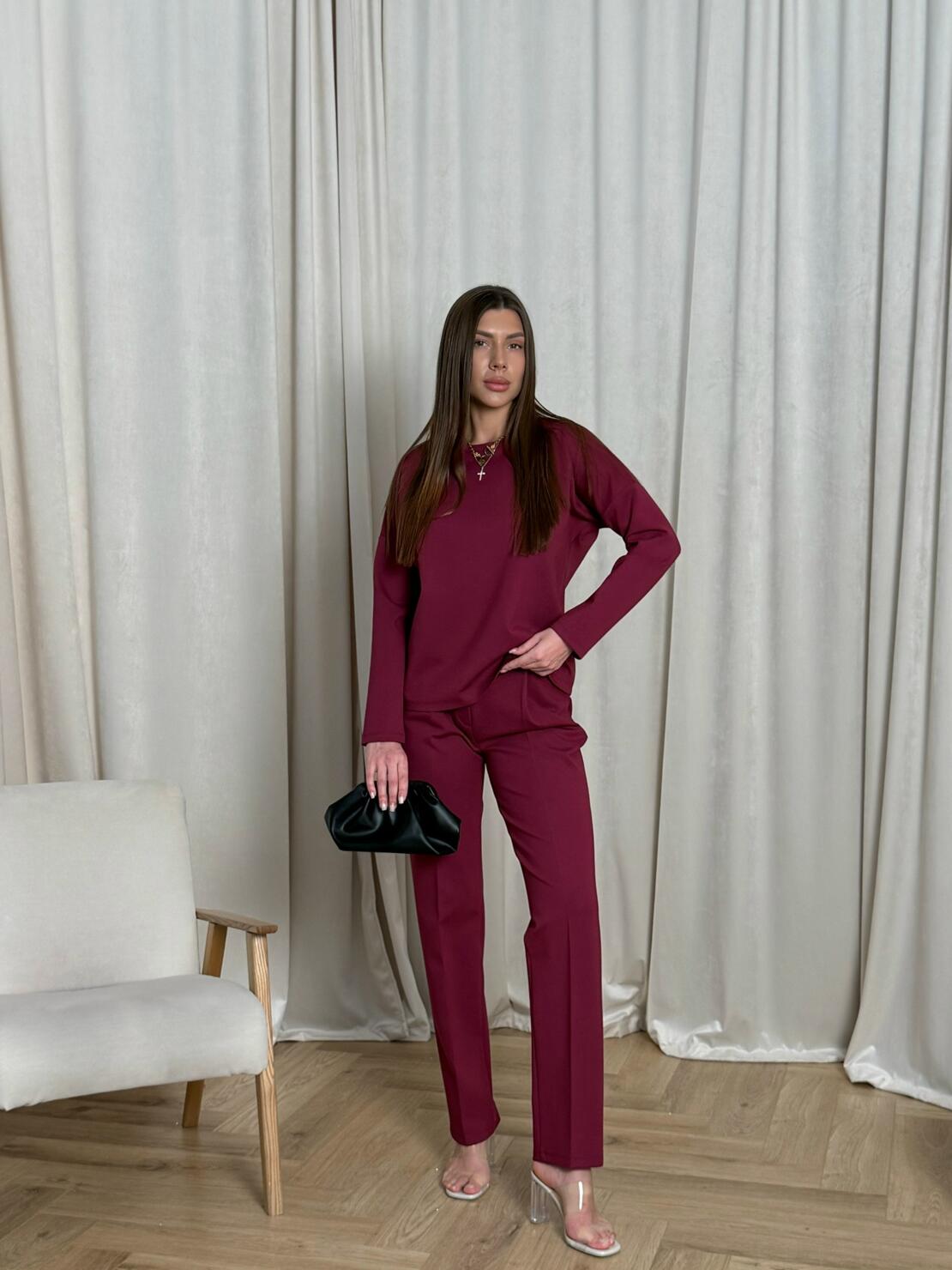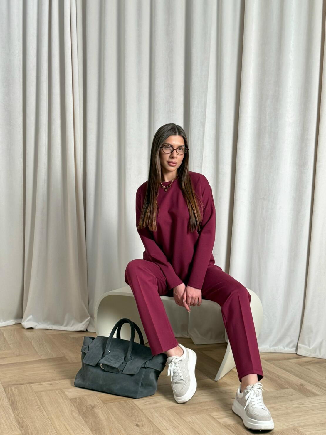 Свободный крой костюма круглый вырез на свитшоте, брюки на завышенной талии с защипами и боковыми карманами.