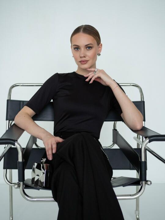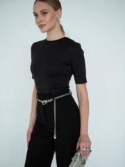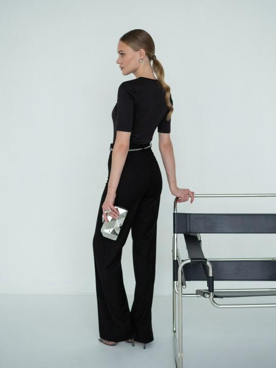 Боди «SKIMS» в черном цвете из мягкого рельефного трикотажа комфортно прилегает к телу и почти не ощущается — его удобно носить под жакет или свитер.
