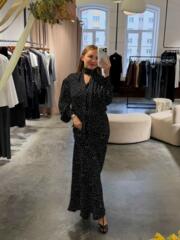 Лаконичная юбка макси в горошек с посадкой на талии скроена по косой — она мягко очерчивает бедра, а силуэт напоминает русалочий хвост.
