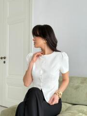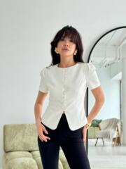 Приталенный крой, лаконичный фасон и главный акцент — объемный рукав-фонарик. Блейзер сшит из высококачественной костюмной ткани в базовом «молочном» оттенке.